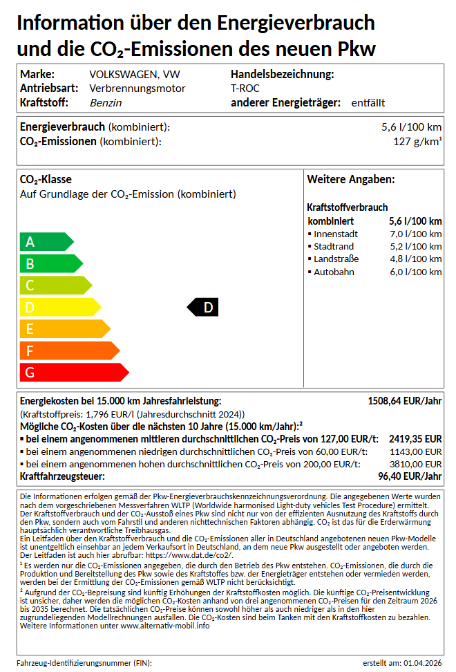 Kraftstoffverbrauch (kombiniert): 5,6 l/100 km, CO₂-Emissionen: 127 g/km